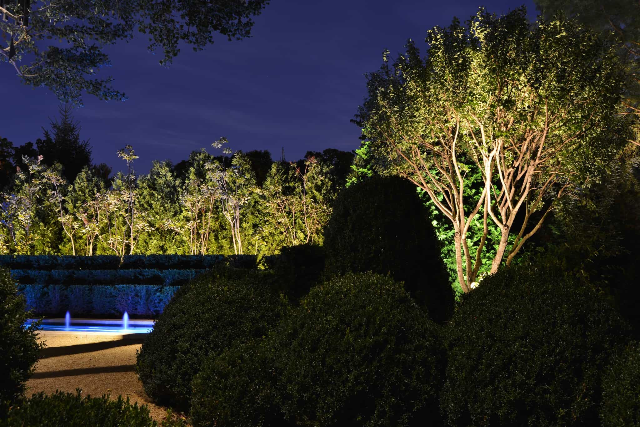 - Down lighting highlights the path while washing the texture of the boxwoods. Accent lighting on the trees behind the boxwoods adds depth to the garden at night.